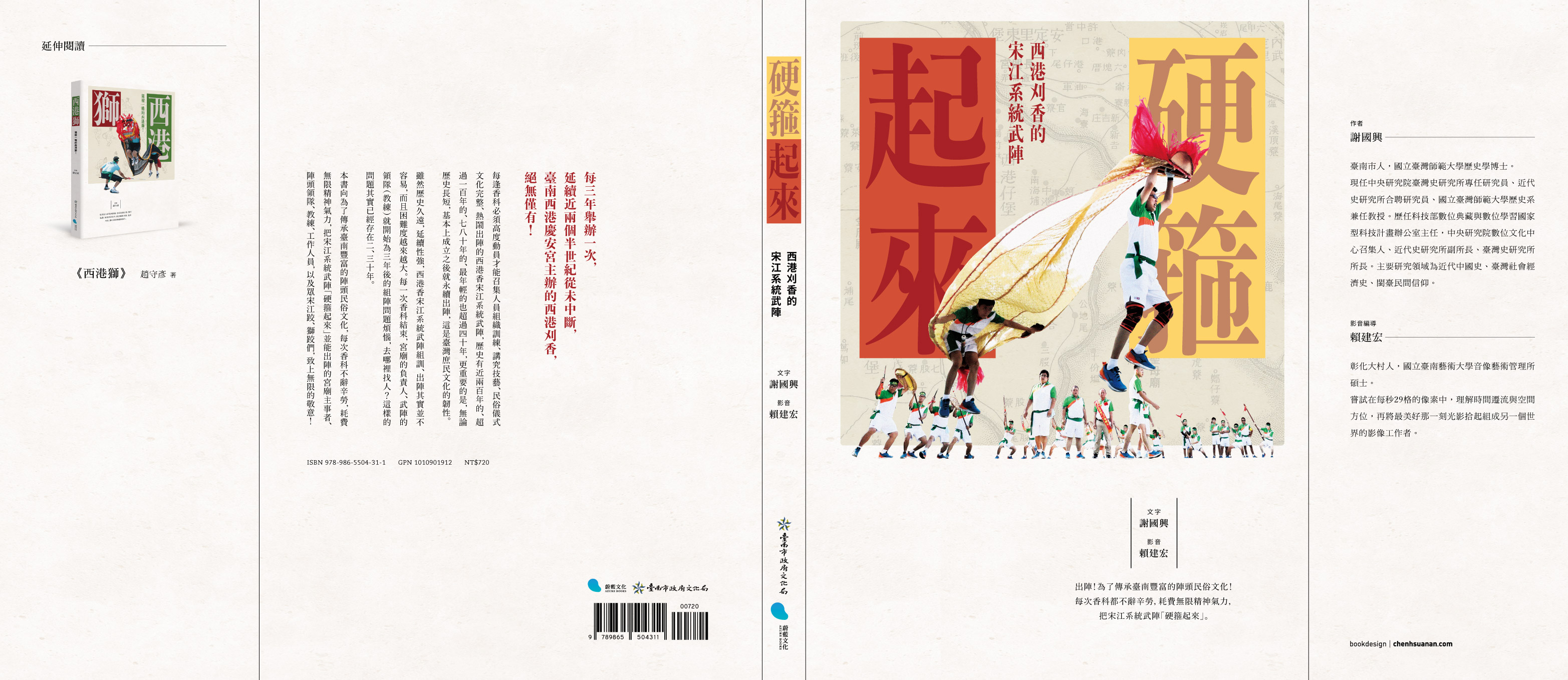 「西港刈香」俗稱西港香,是文化部登錄的國家級重要民俗,為臺南市西港慶安宮主辦的定期王醮廟會活動,傳承久遠、保有數量不少的庄頭陣,陣頭儀式保存完整、技藝精良,呈現豐富多元的民俗傳承與信仰文化。但想要長期維持這些珍貴的文化資產,對負責組陣的所有宮廟來說,仍存在諸多困難與隱憂。 《硬箍起來:西港刈香的宋江系統武陣》一書主要深入紀錄包含宋江獅陣自籌組開館、出陣、謝館等過程,並搭配四部紀錄片:「老牌紅腳巾」(西港香科武陣成立最早的西港檨子林鳳安宮宋江陣)、「仙姑娘媽の宋江」(西港香科起源地的西港八份姑媽宮宋江陣)、「金獅出陣」(成立較晚但甚具特色的佳里塭內/蚶寮永昌宮金獅陣)、「箍子內」(綜合性影片,介紹曾文溪流域宋江系統武陣的過去淵源、文化資產形式與價值,以及現在與未來面臨的各種問題)。讓各界有更多機會認識臺灣的民俗文化傳統以及曾文溪流域傳統廟會陣頭文化,共同思考臺南與臺灣珍貴的無形文化資產傳承與維護議題。