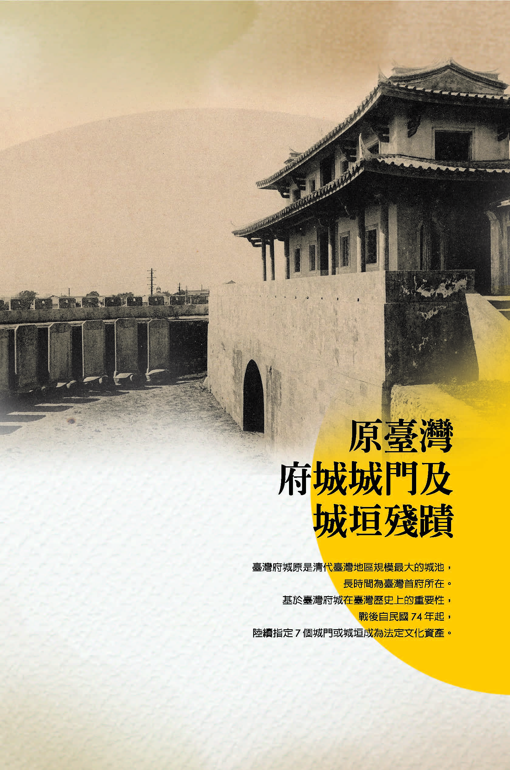 臺灣府城原是清代臺灣地區規模最大的城池,長時間為臺灣首府所在。基於臺灣府城在臺灣歷史上的重要性,戰後自民國74年起,陸續指定7個城門或城垣成為法定文化資產。