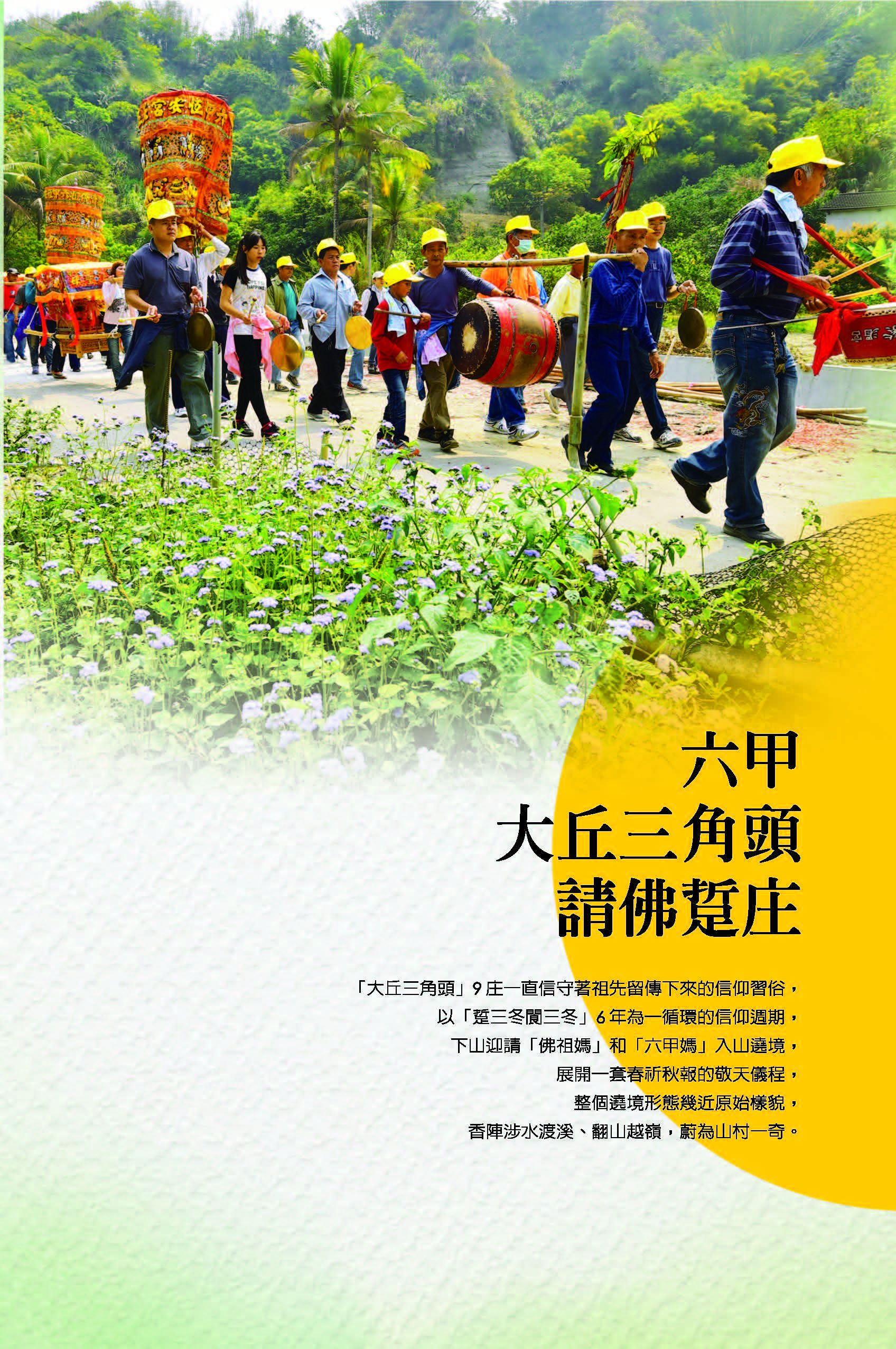 沿著174線市道進入六甲大丘山區,盡是蜿蜒的山路、起伏的山嶺、青翠的山林、清涼的山風;隱身於山林之間、山嶺之巔的大小山村,依然過著日出而作、日入而息的山居生活,聽到的,都只是鳥叫聲、雞鳴聲、風雨聲,只有到了開春的「請佛踅庄」,才會聽得到鑼鼓聲、鞭炮聲、辦桌聲。「大丘三角頭」9庄一直信守著祖先留傳下來的信仰習俗,以「踅三冬閬三冬」6年為一循環的信仰週期,下山迎請「佛祖媽」和「六甲媽」入山遶境,展開一套春祈秋報的敬天儀程,整個遶境形態幾近原始樣貌,香陣涉水渡溪、翻山越嶺,蔚為山村一奇。